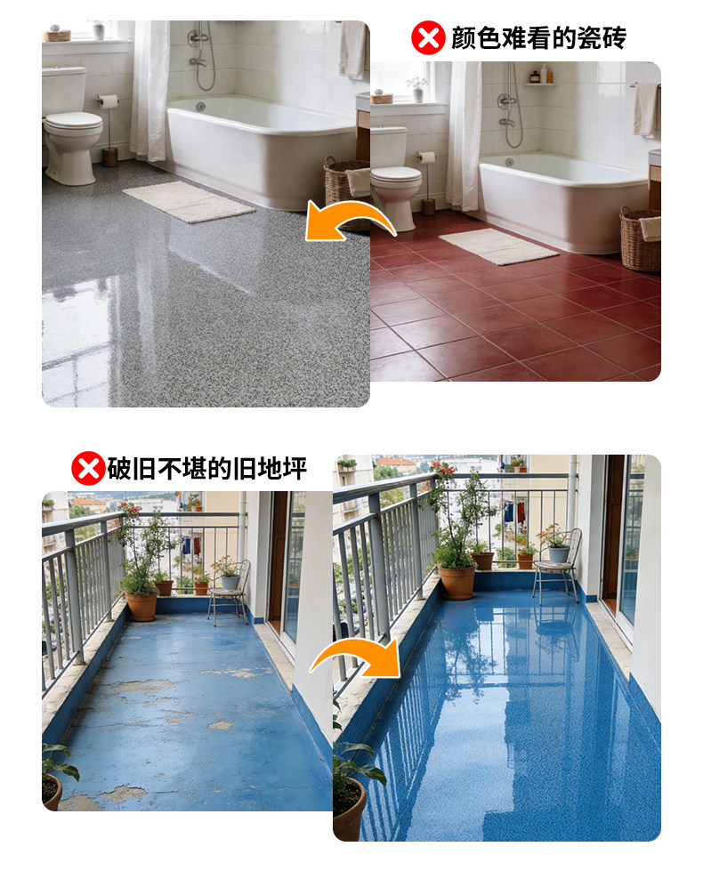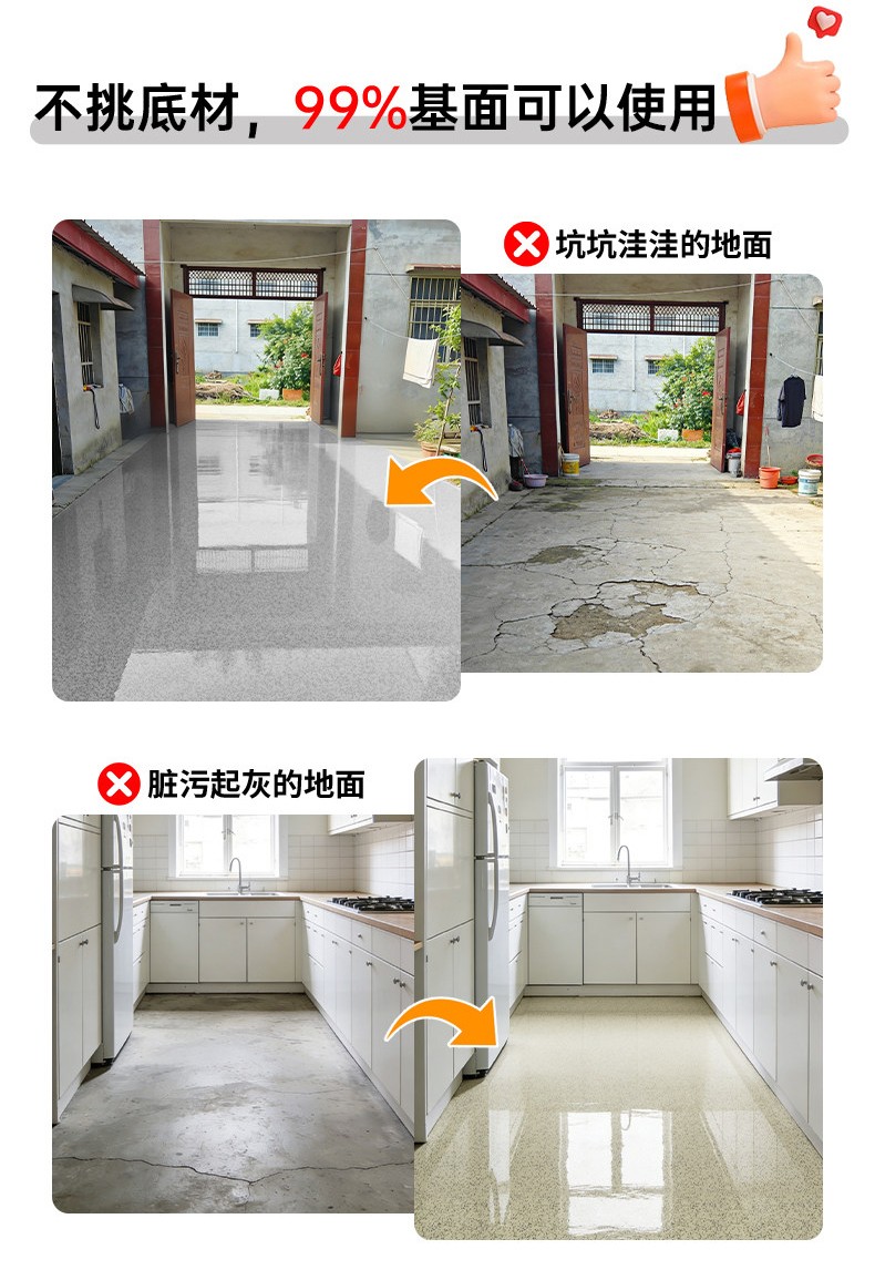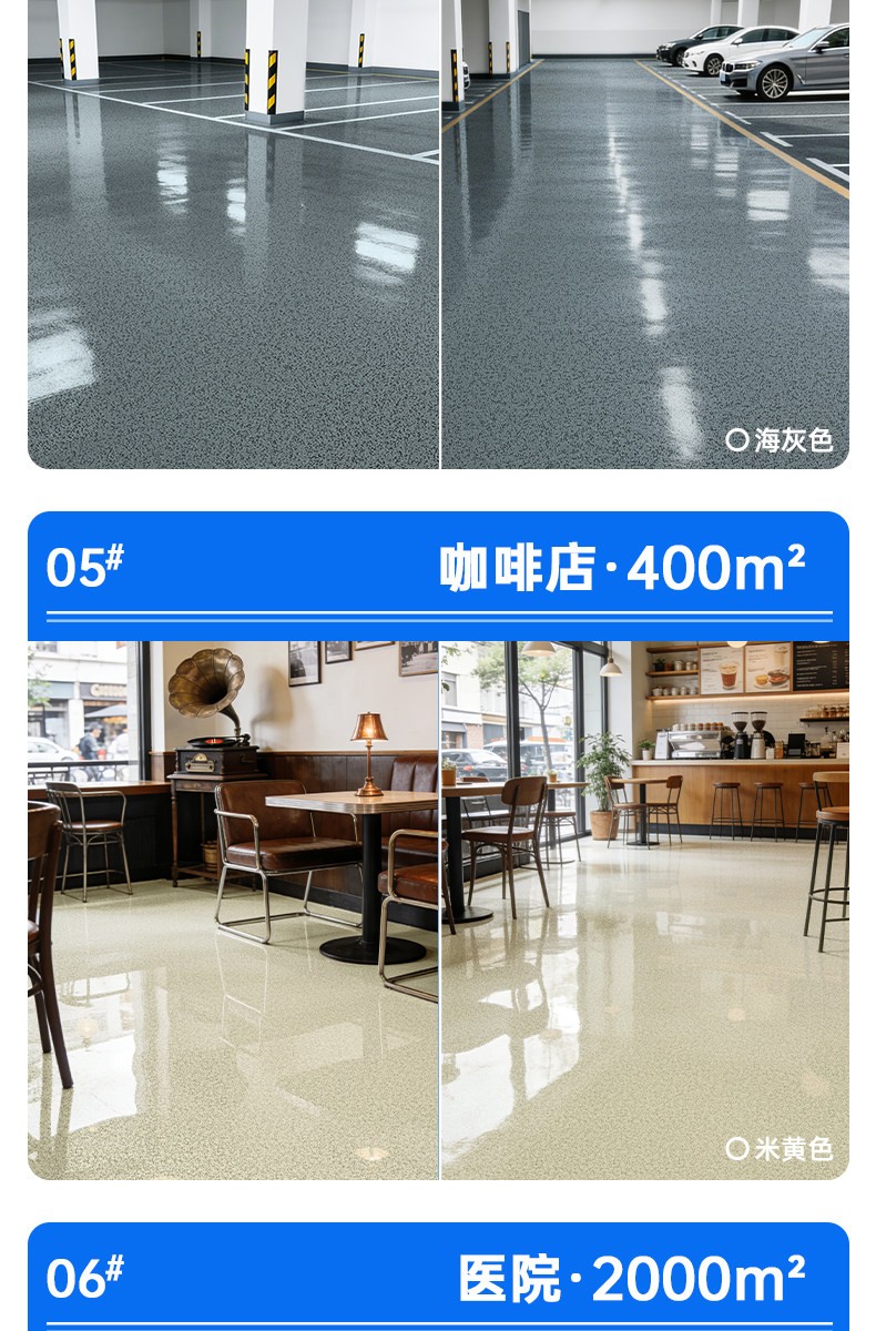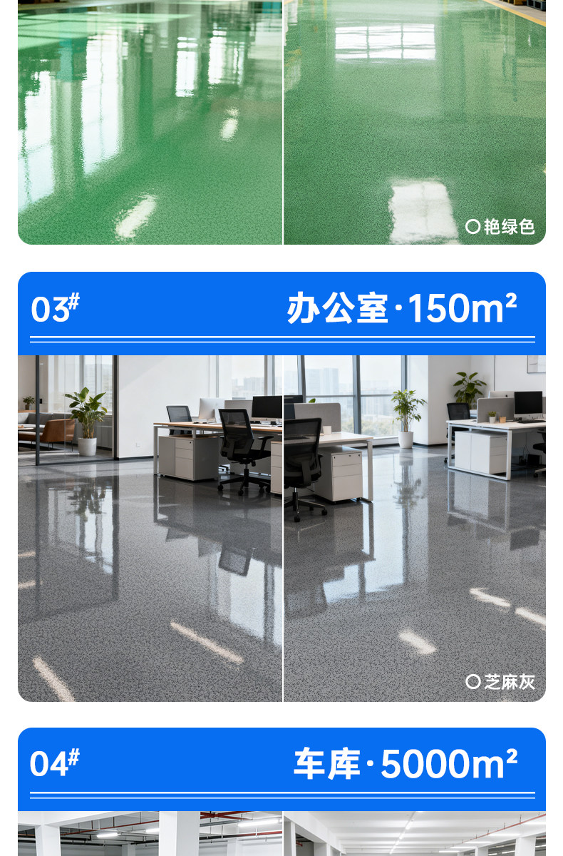 ✅ 环保安全,适配性广:食品级环保配方可选,无异味、抑菌防尘,符合食品医药、学校、办公等场景的安全标准;适配水泥、混凝土、水磨石等所有室内硬质基材,基层处理简单,施工便捷高效;